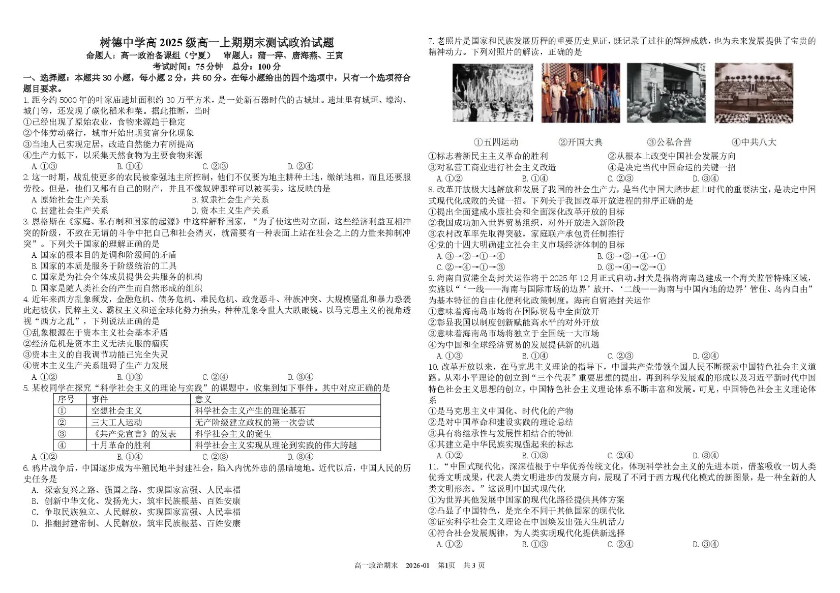 高一政治+答案--四川省成都市树德中学2025-2026学年高一上学期期末