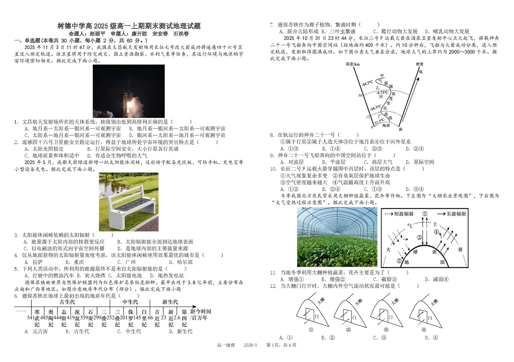 高一地理+答案--四川省成都市树德中学2025-2026学年高一上学期期末
