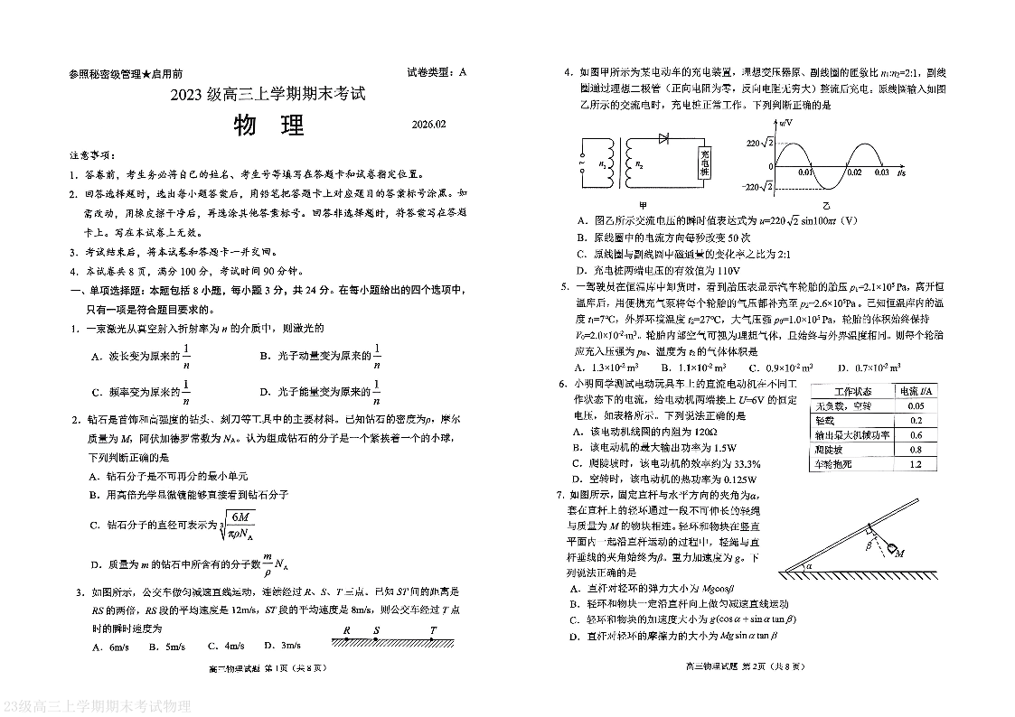 高三物理--山东省日照市2023级(2026届)高三年级上学期期末考试