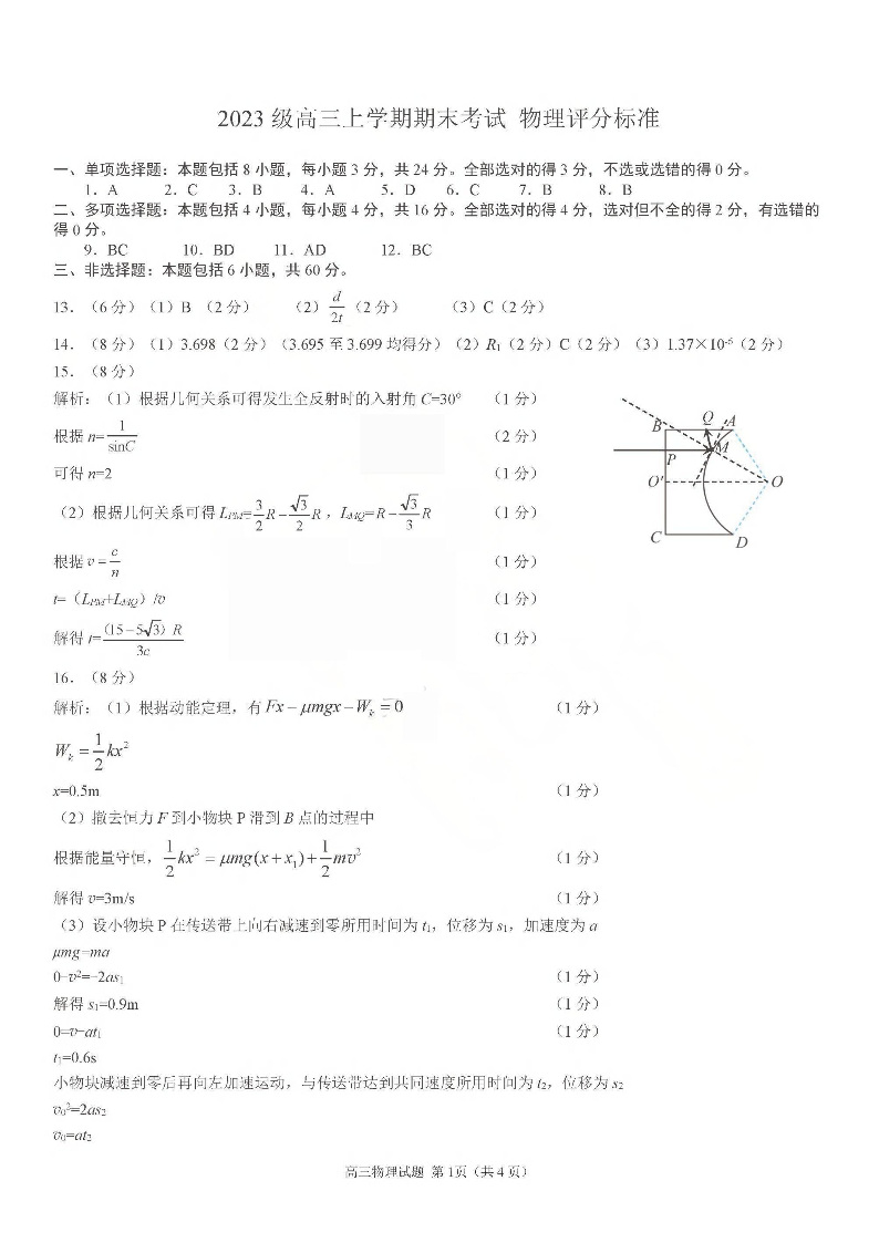 高三物理答案--山东省日照市2023级(2026届)高三年级上学期期末考试