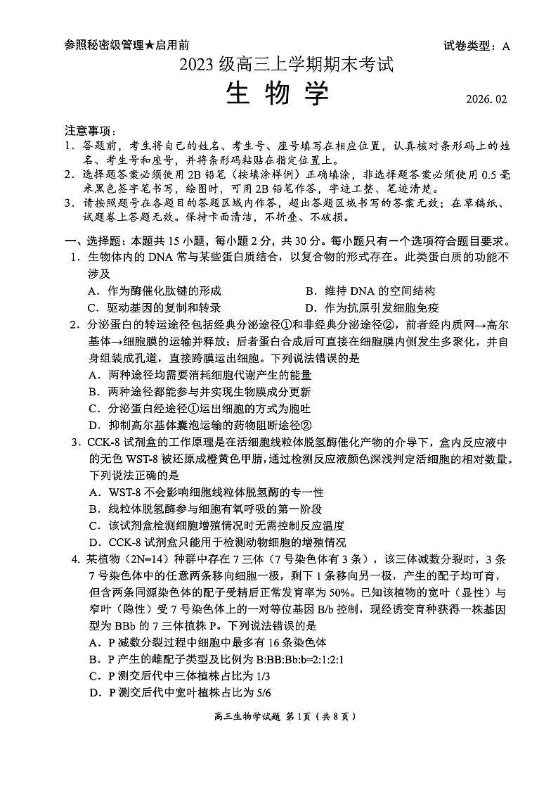 高三生物--山东省日照市2023级(2026届)高三年级上学期期末考试