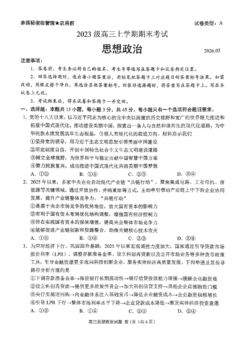 高三政治--山东省日照市2023级(2026届)高三年级上学期期末考试