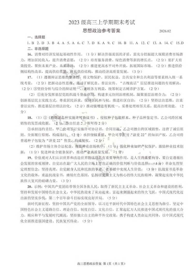 高三政治答案--山东省日照市2023级(2026届)高三年级上学期期末考试