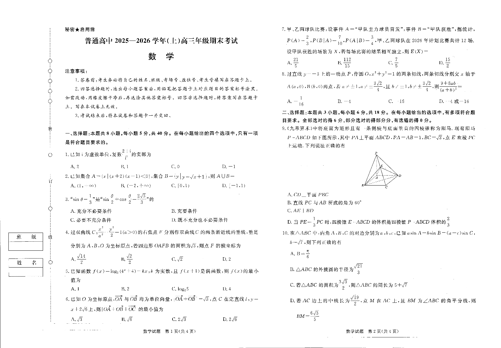 高三数学--河南省青桐鸣大联考普通高中2026届高三上学期期末考试