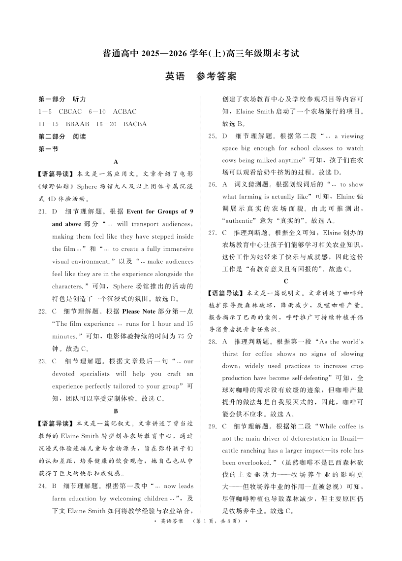 高三英语答案--河南省青桐鸣大联考普通高中2026届高三上学期期末考试