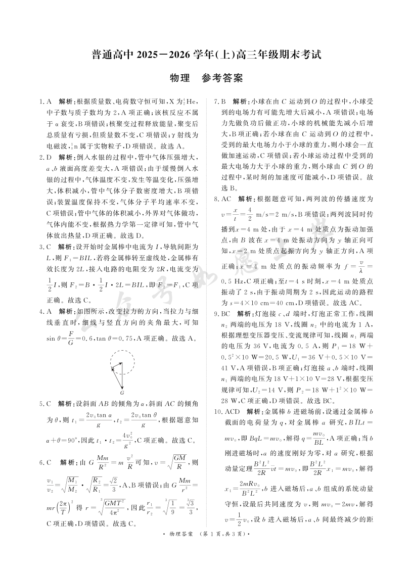 高三物理答案--河南省青桐鸣大联考普通高中2026届高三上学期期末考试