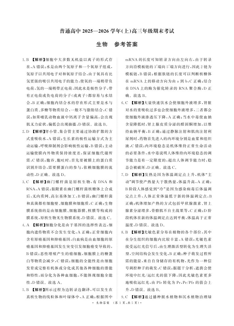 高三生物答案--河南省青桐鸣大联考普通高中2026届高三上学期期末考试