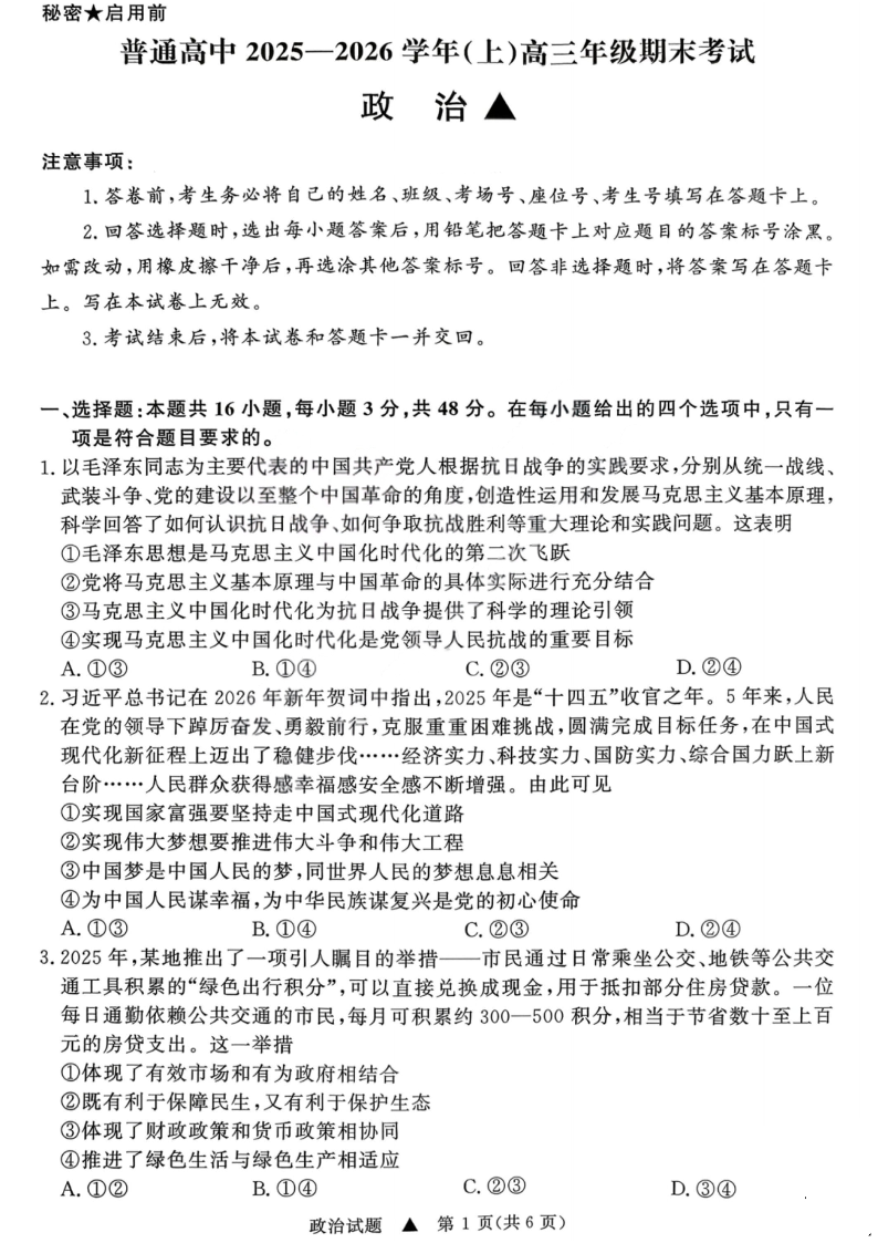 高三政治--河南省青桐鸣大联考普通高中2026届高三上学期期末考试
