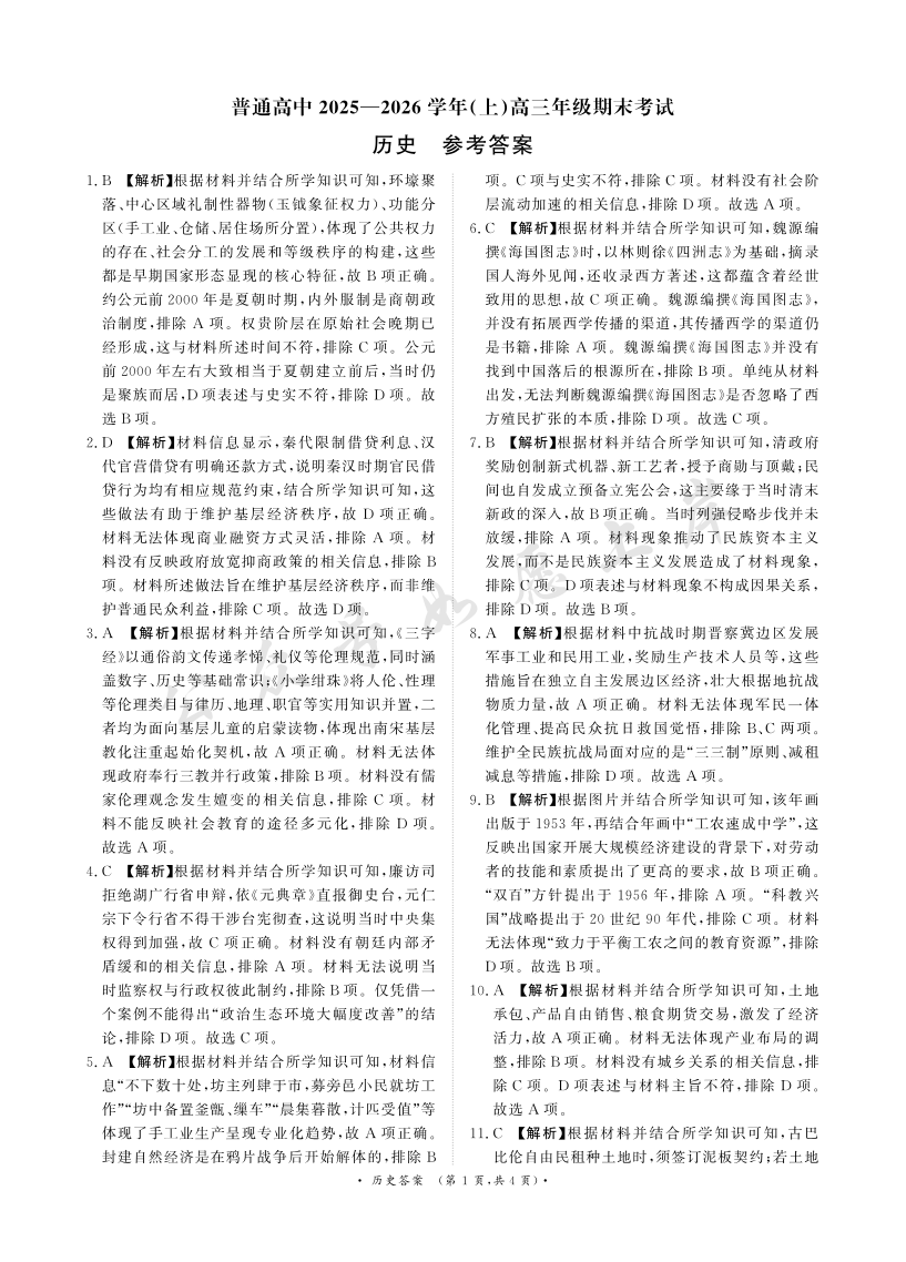 高三历史答案--河南省青桐鸣大联考普通高中2026届高三上学期期末考试