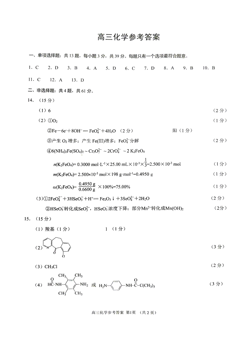 高三化学答案--江苏省苏州市2026届高三上学期期末考试(苏州零模)