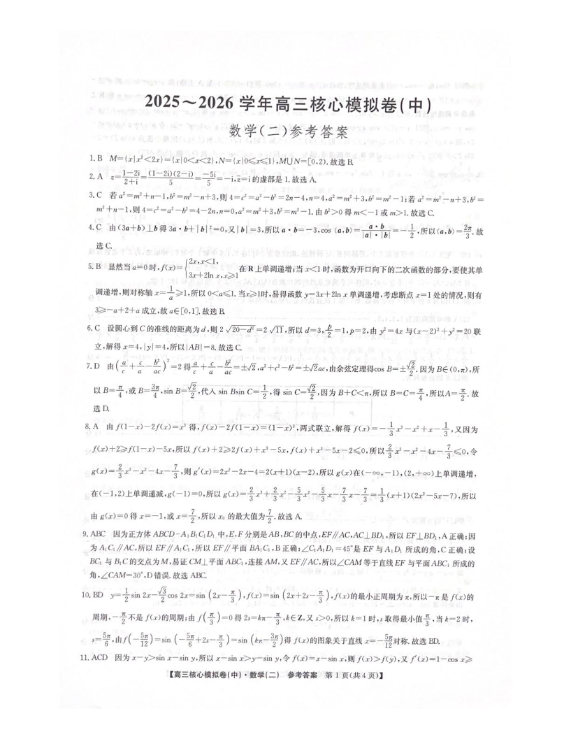 高三数学答案--九师联盟2026届高三核心模拟卷(中) (二)