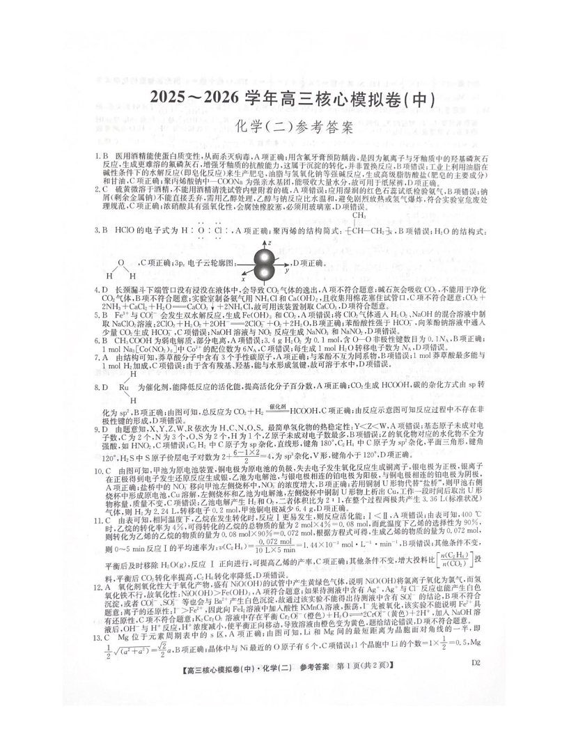 高三化学答案--九师联盟2026届高三核心模拟卷(中) (二)