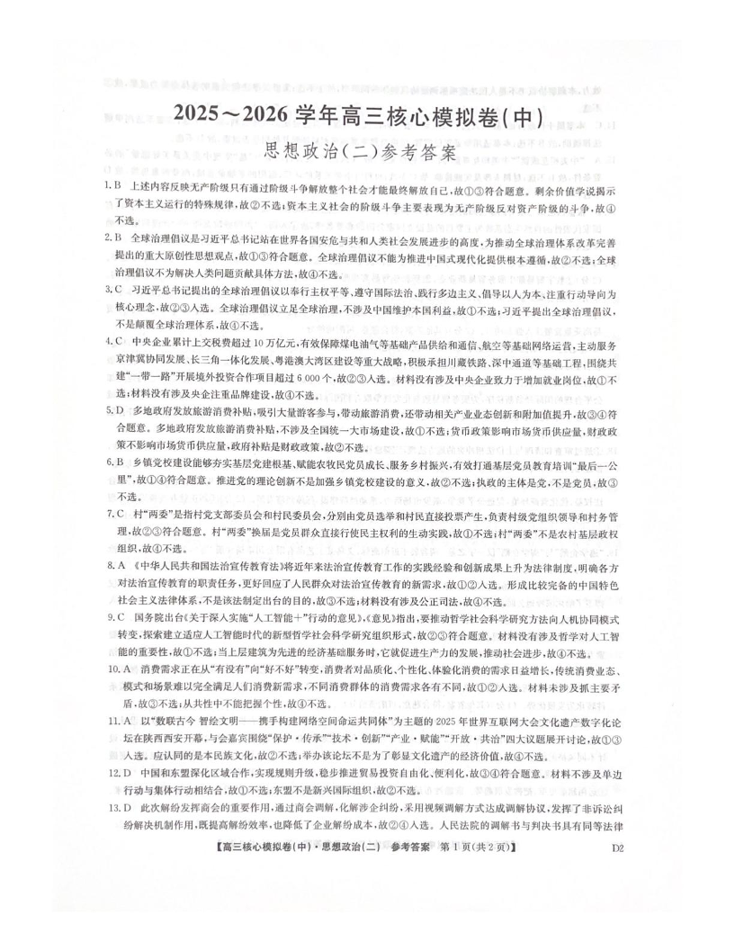 高三政治答案--九师联盟2026届高三核心模拟卷(中) (二)