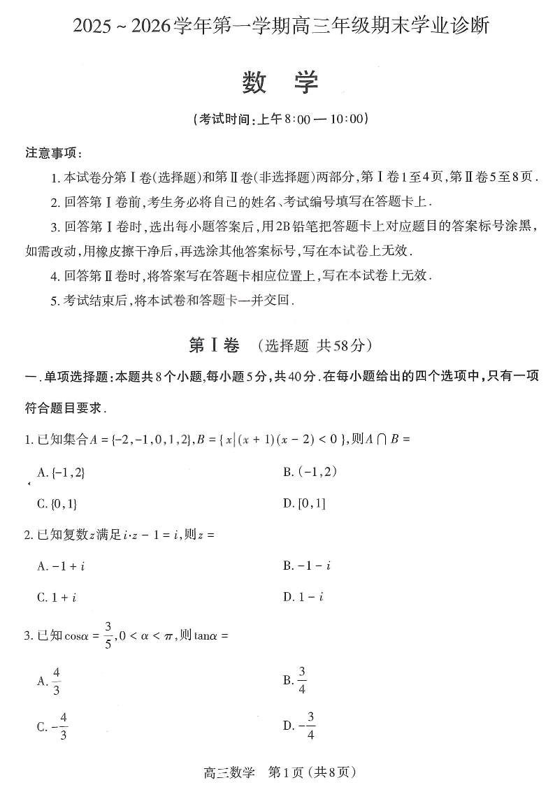 高三数学--山西省太原市2026届第一学期高三年级期末学业诊断