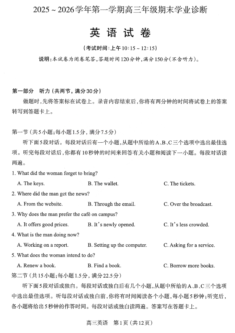 高三英语--山西省太原市2026届第一学期高三年级期末学业诊断