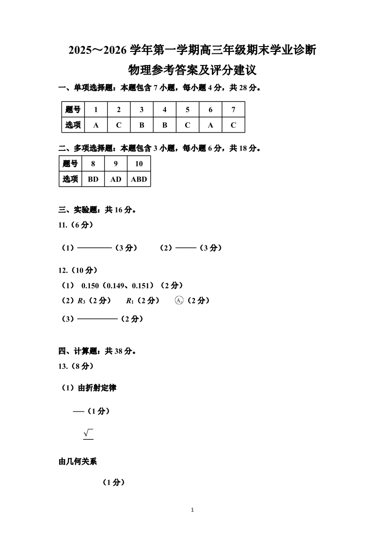 高三物理答案--山西省太原市2026届第一学期高三年级期末学业诊断