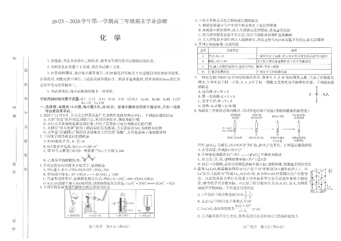 高三化学--山西省太原市2026届第一学期高三年级期末学业诊断