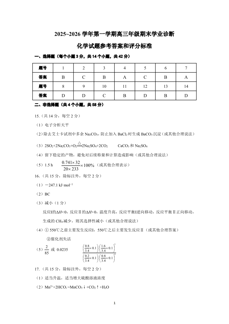 高三化学答案--山西省太原市2026届第一学期高三年级期末学业诊断
