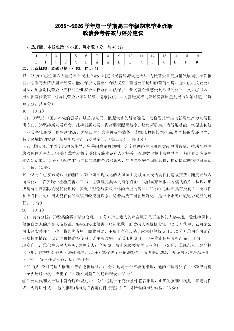 高三政治答案--山西省太原市2026届第一学期高三年级期末学业诊断