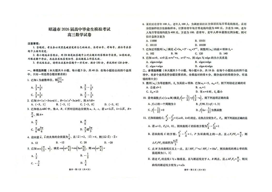 高三数学+答案--云南省昭通市2026届高中毕业生上学期期末模拟考试