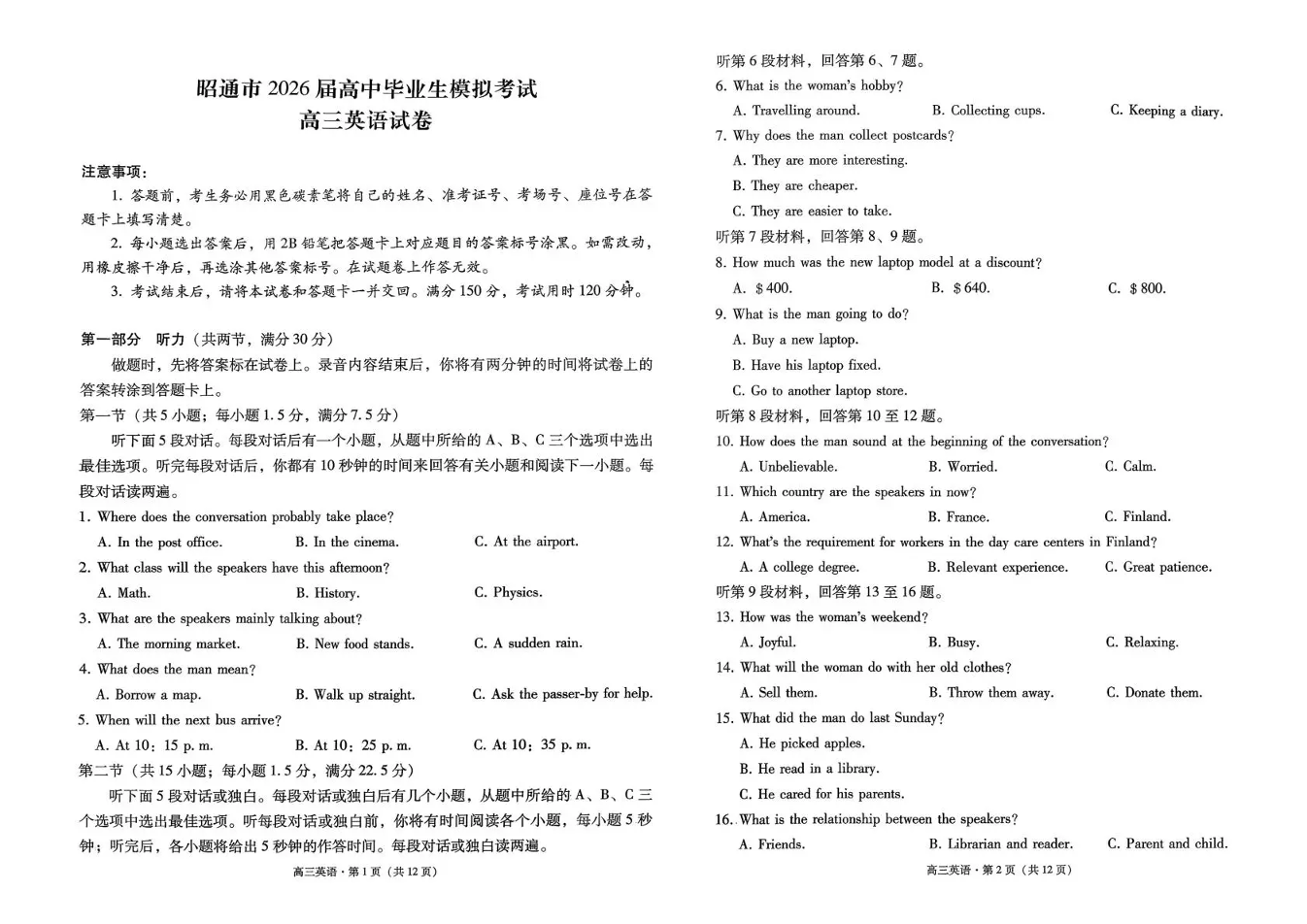 高三英语--云南省昭通市2026届高中毕业生上学期期末模拟考试