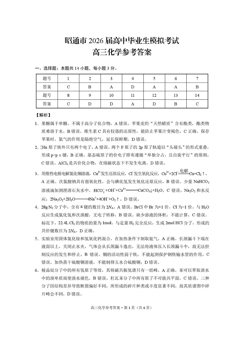 高三化学答案--云南省昭通市2026届高中毕业生上学期期末模拟考试