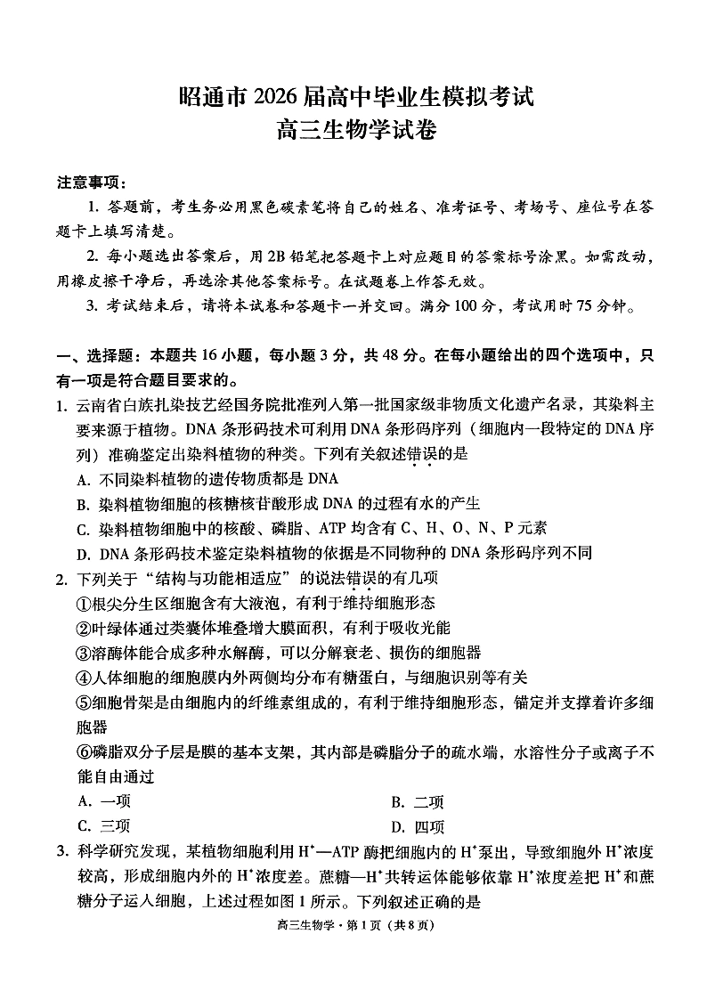 高三生物--云南省昭通市2026届高中毕业生上学期期末模拟考试