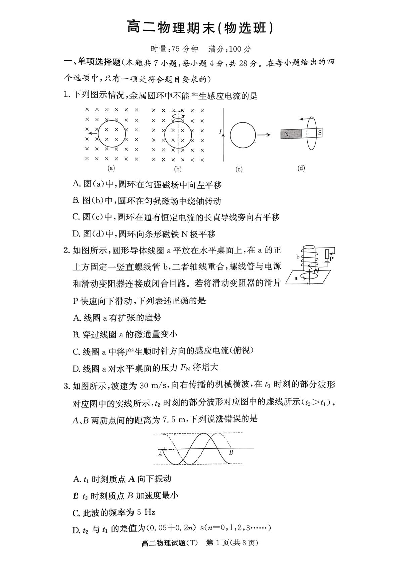 高二物理+答案--湖南师范大学附属中学2025-2026学年高二上学期1月期末试题