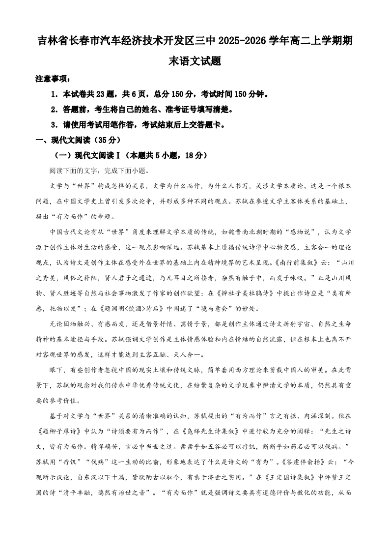 高一语文+答案--吉林省长春市长春汽车经济技术开发区第三中学2025-2026学年高二上学期期末考试