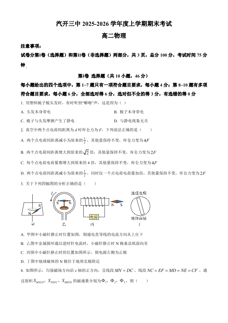 高一物理+答案--吉林省长春市长春汽车经济技术开发区第三中学2025-2026学年高二上学期期末考试