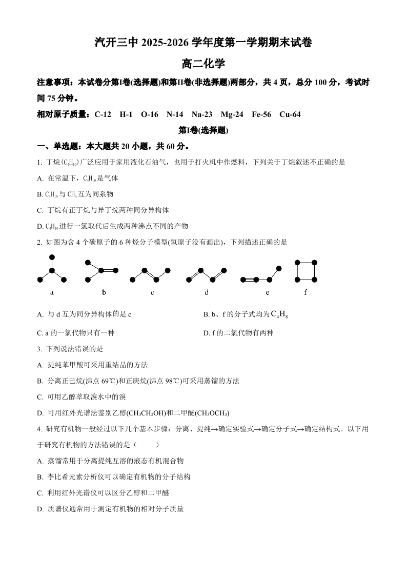 高一化学+答案--吉林省长春市长春汽车经济技术开发区第三中学2025-2026学年高二上学期期末考试