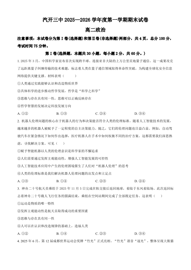 高一政治+答案--吉林省长春市长春汽车经济技术开发区第三中学2025-2026学年高二上学期期末考试