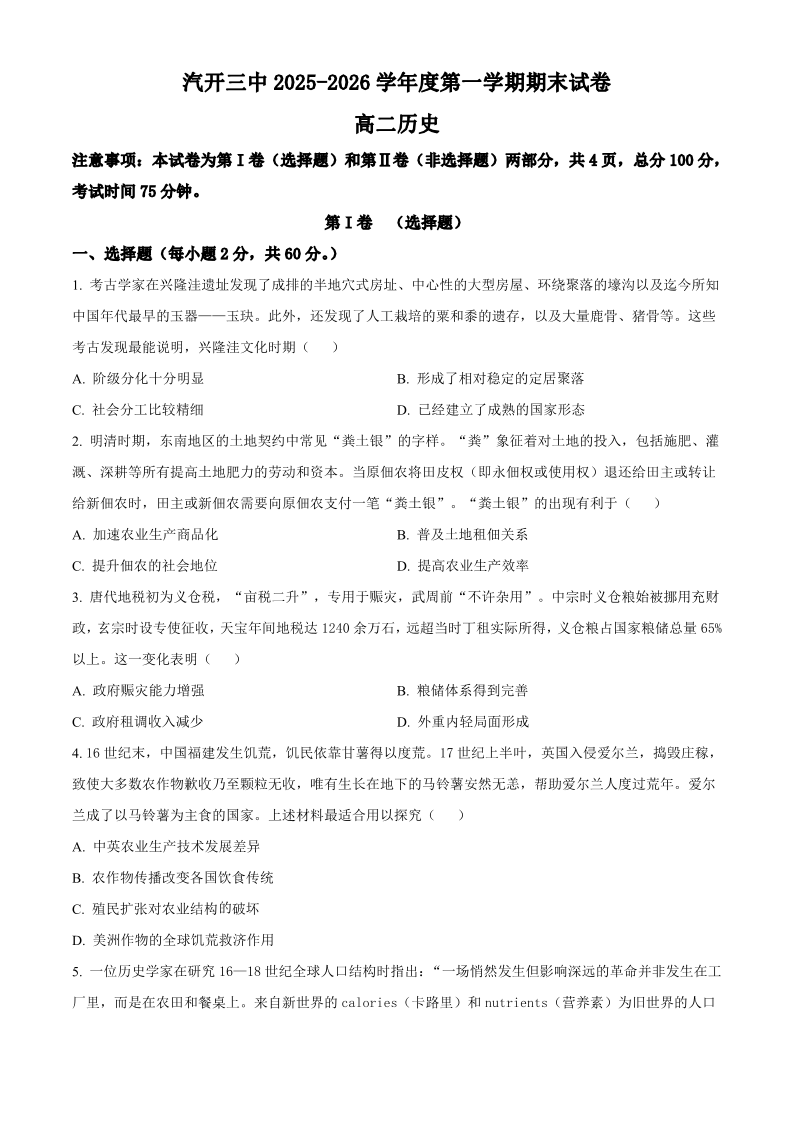 高一历史+答案--吉林省长春市长春汽车经济技术开发区第三中学2025-2026学年高二上学期期末考试