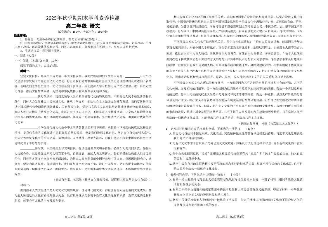 高二语文+答案--广西贵港市部分高中2025-2026学年高二上学期期末学科素养检测