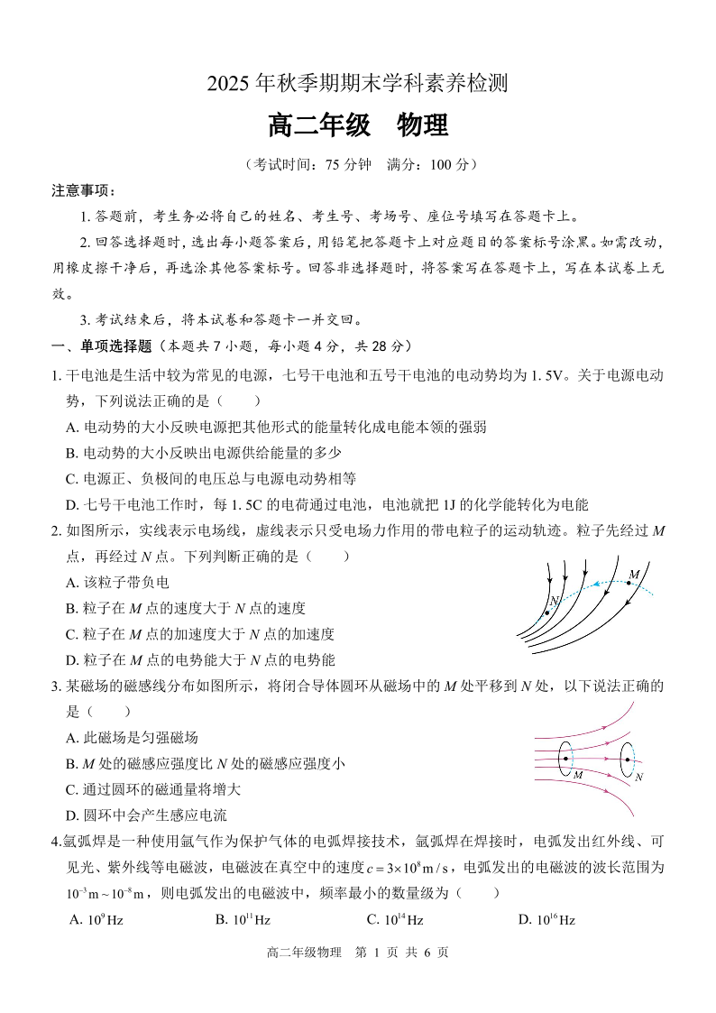 高二物理--广西贵港市部分高中2025-2026学年高二上学期期末学科素养检测
