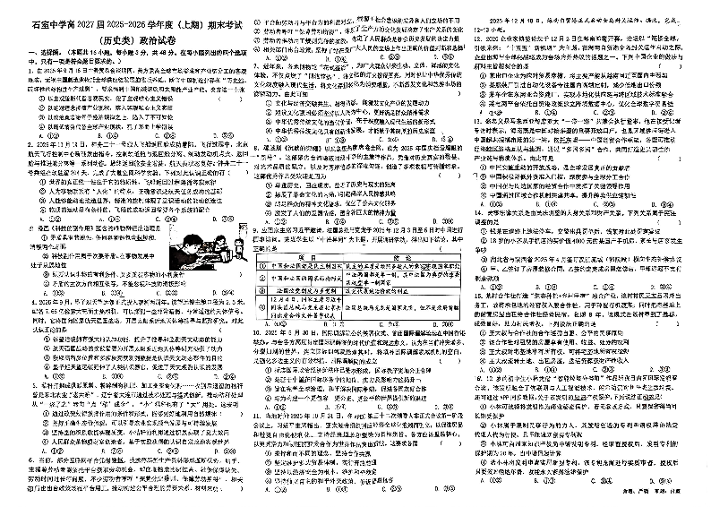 高一政治--四川省成都石室中学2025-2026学年度上期高二期末考试