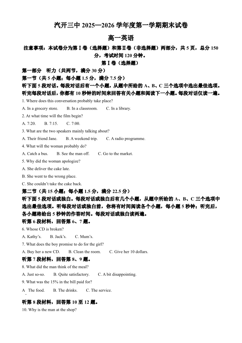 高一英语+答案--吉林省长春市长春汽车经济技术开发区第三中学2025-2026学年高一上学期期末考试