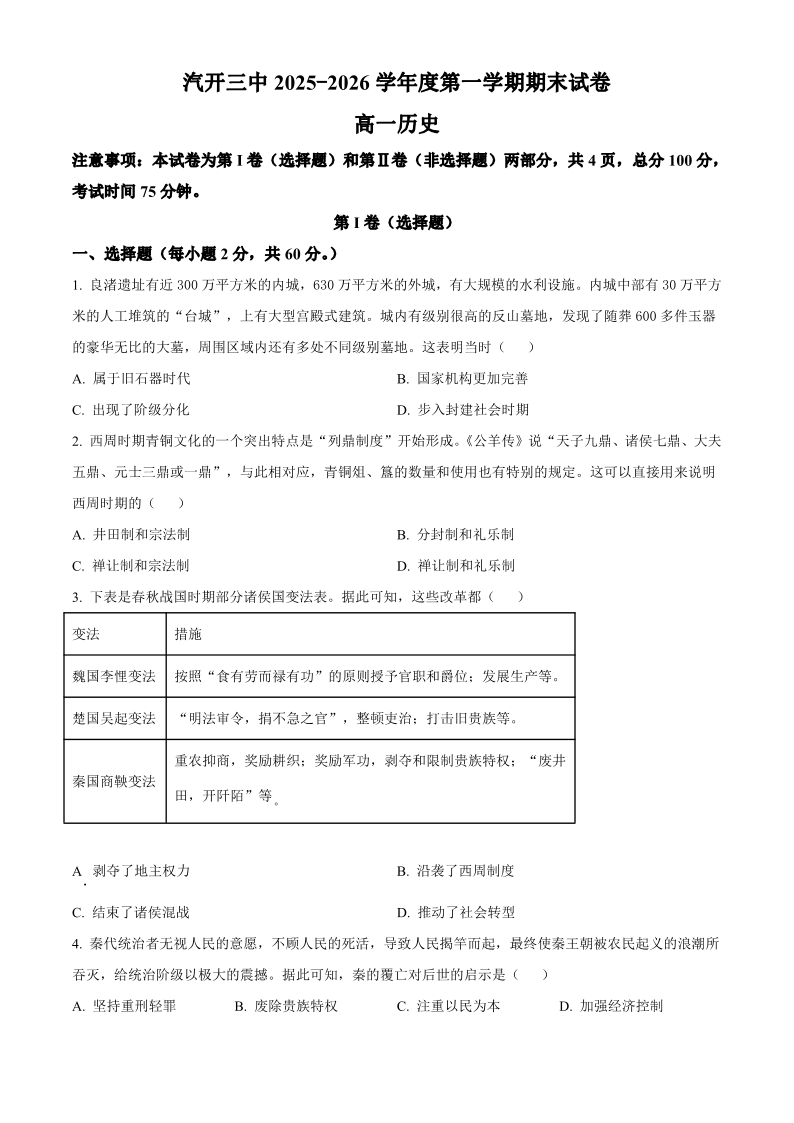 高一历史+答案--吉林省长春市长春汽车经济技术开发区第三中学2025-2026学年高一上学期期末考试
