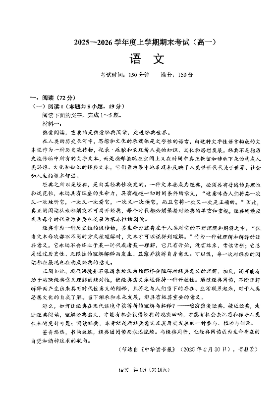 高一语文+答案--辽宁省鞍山市2025-2026学年高一上学期期末考试