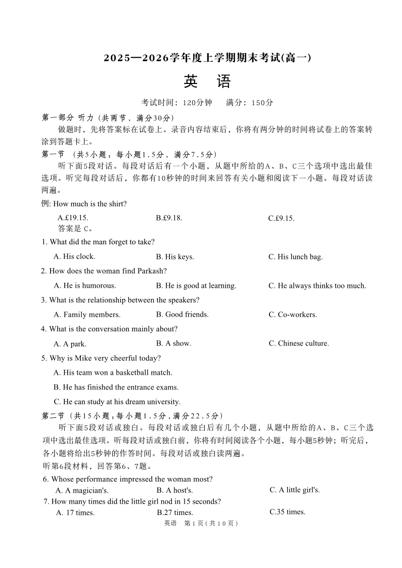 高一英语+答案--辽宁省鞍山市2025-2026学年高一上学期期末考试