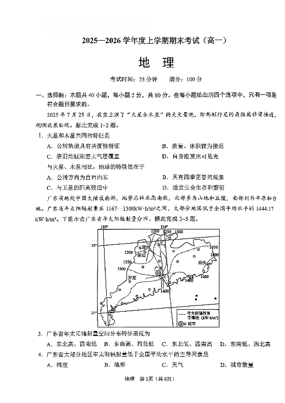 高一地理+答案--辽宁省鞍山市2025-2026学年高一上学期期末考试
