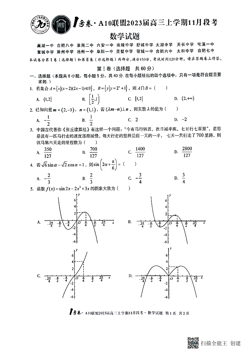 高三数学--安徽A10联盟2023届高三上学期11月段考