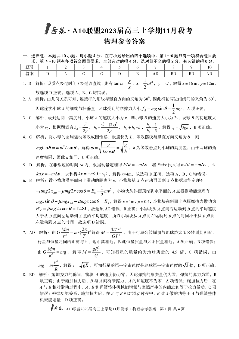 高三物理答案--安徽A10联盟2023届高三上学期11月段考
