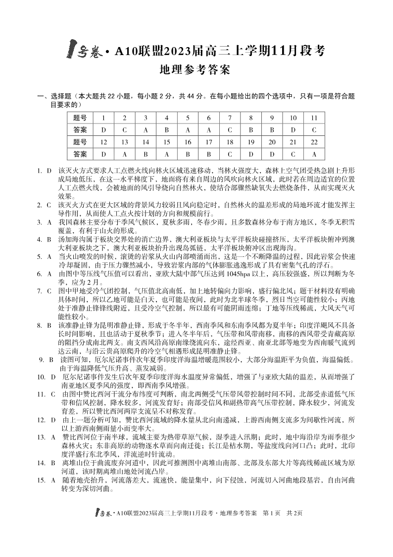 高三地理答案--安徽A10联盟2023届高三上学期11月段考