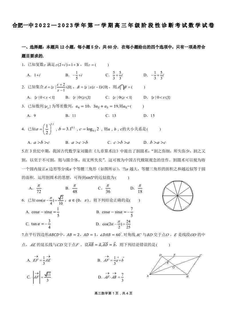 高三数学--安徽省合肥市第一中学高三上学期11月月考