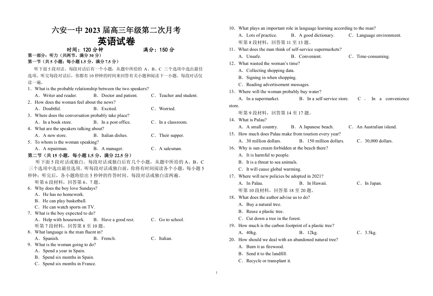 高三英语+答案--安徽省六安第一中学高三上学期第二次月考