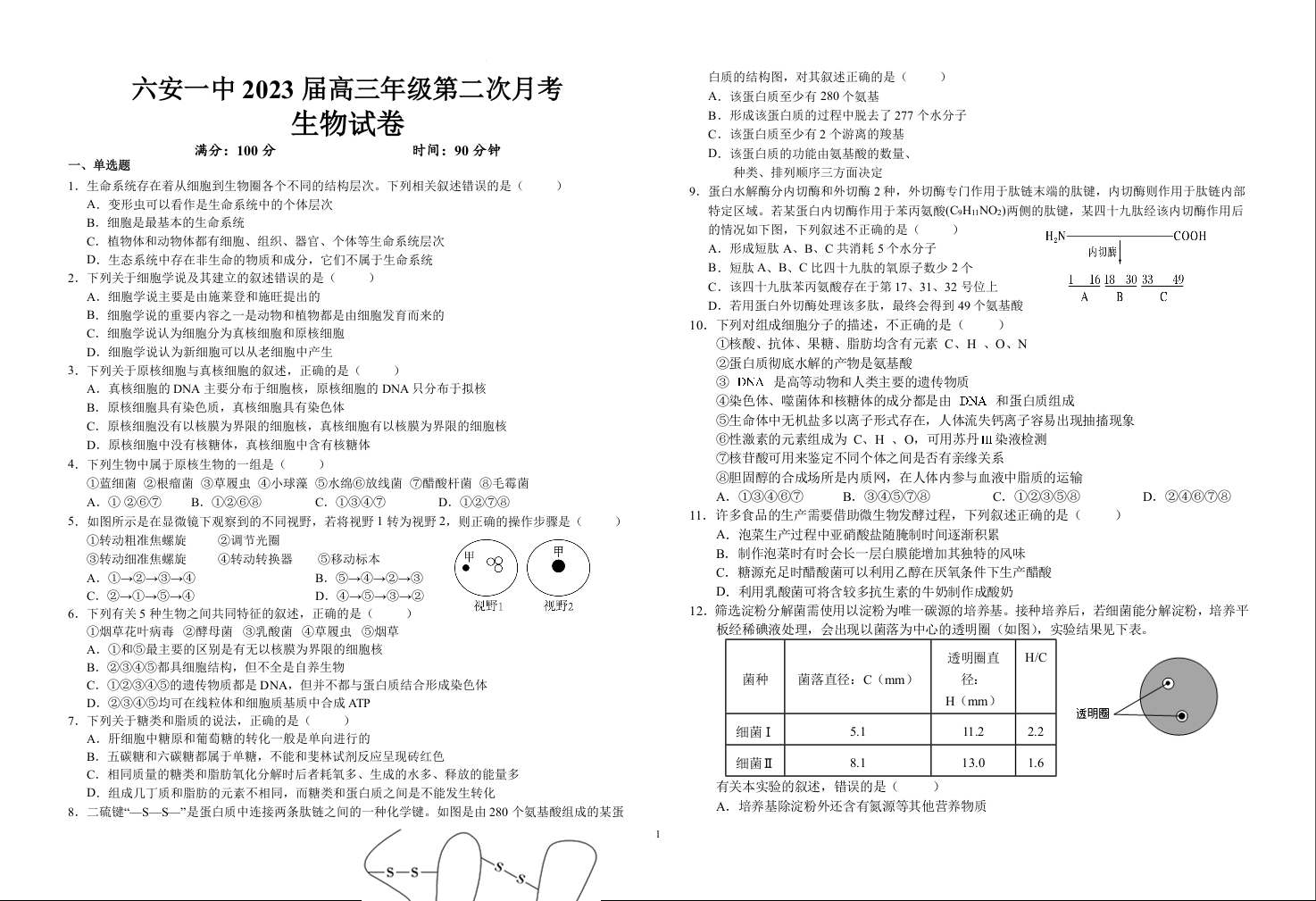 高三生物+答案--安徽省六安第一中学高三上学期第二次月考