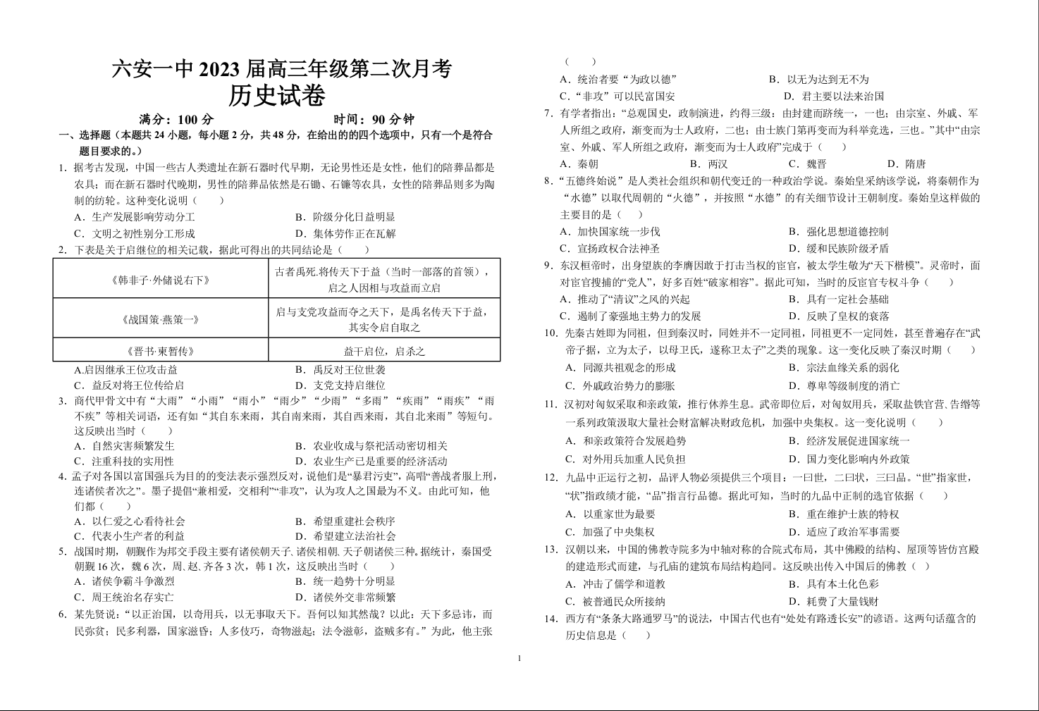 高三历史+答案--安徽省六安第一中学高三上学期第二次月考