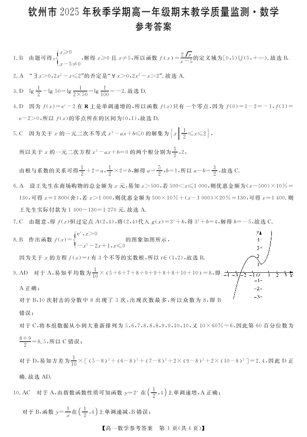 高一数学答案--广西钦州市2025-2026高一上学期期末教学质量检测
