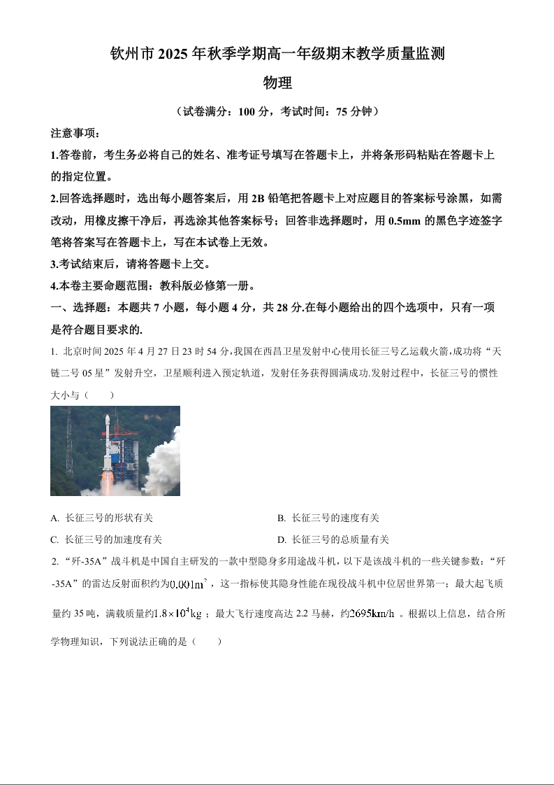 高一物理+答案--广西钦州市2025-2026高一上学期期末教学质量检测